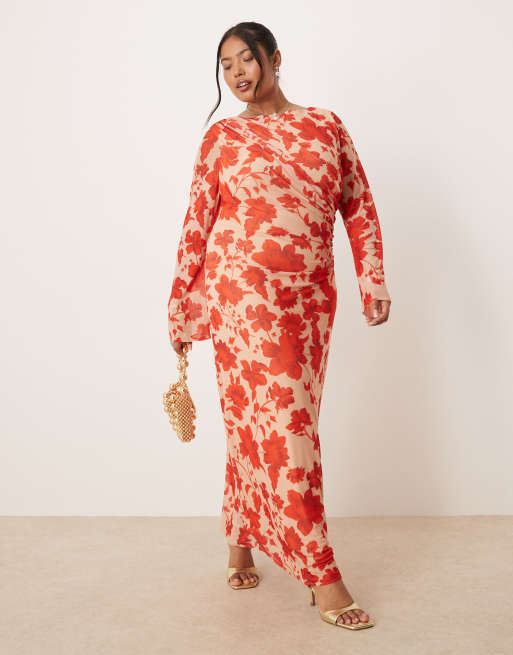 Pretty Lavish Curve - Ethel - Midaxi jurk van jersey met lange mouwen in rode bloemenprint