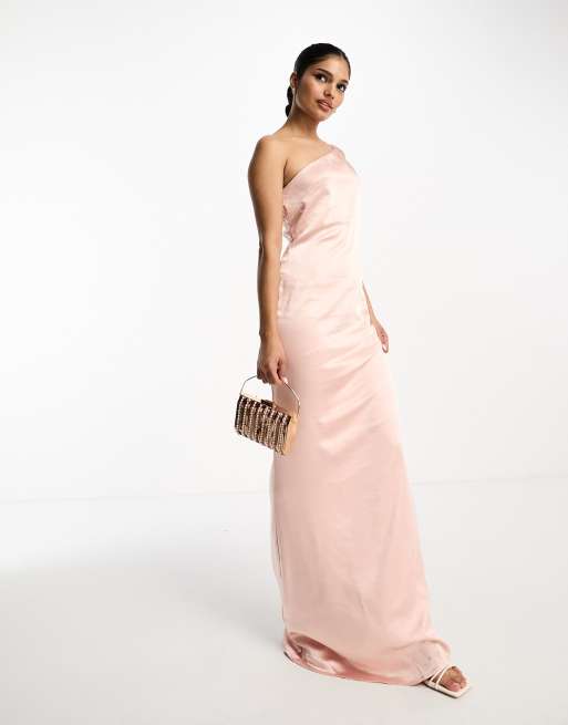 Pretty Lavish - Bruidsmeisjes - Lange satijnen jurk met blote schouder in beigeroze