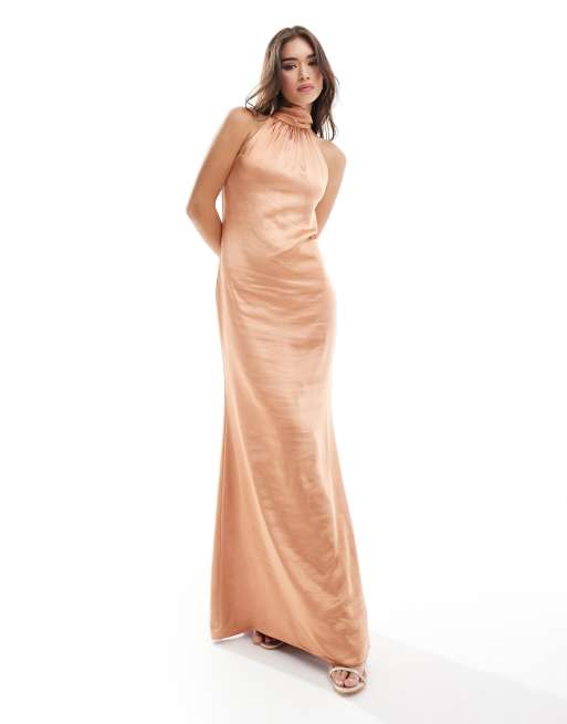 Pretty Lavish - Bruidsmeisjes - Odelle - Hoogsluitende satijnen maxi jurk in kaneelkleur