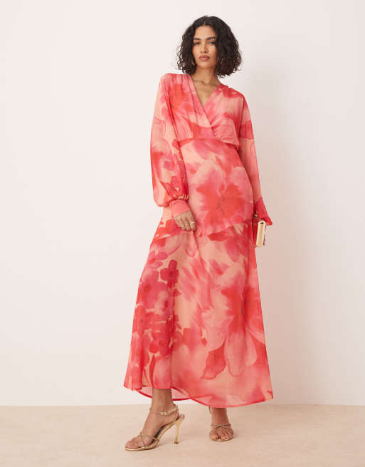 Pretty Lavish - Diepuitgesneden maxi jurk met ballonmouwen in roze en rode bloemenprint