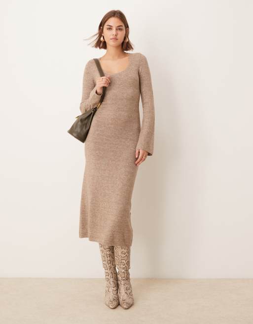 Pretty Lavish - Gebreide midaxi jurk met lage ronde hals in zachtbruin