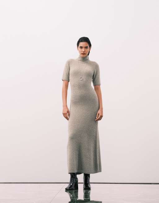 Pretty Lavish - Hoogsluitende pluizige gebreide maxi-jurk met col en korte mouwen in saliegroen