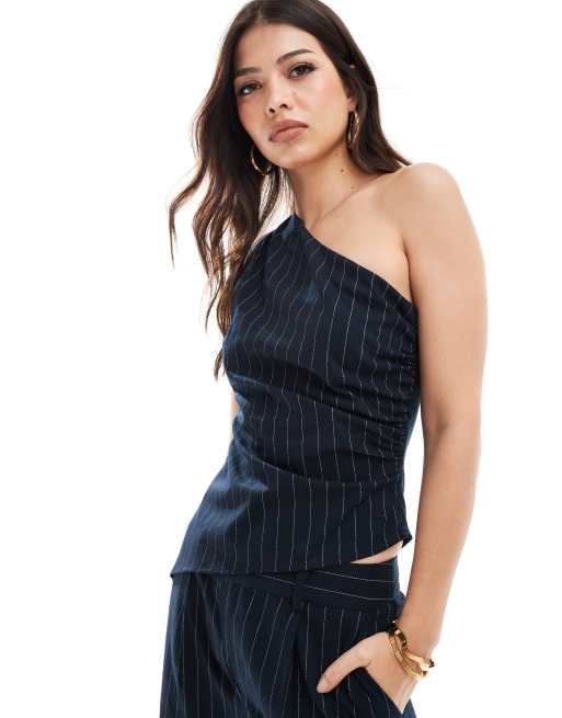 Pretty Lavish - Top met blote schouder en rimpeleffect in marineblauwe krijtstreep, deel van co-ord set