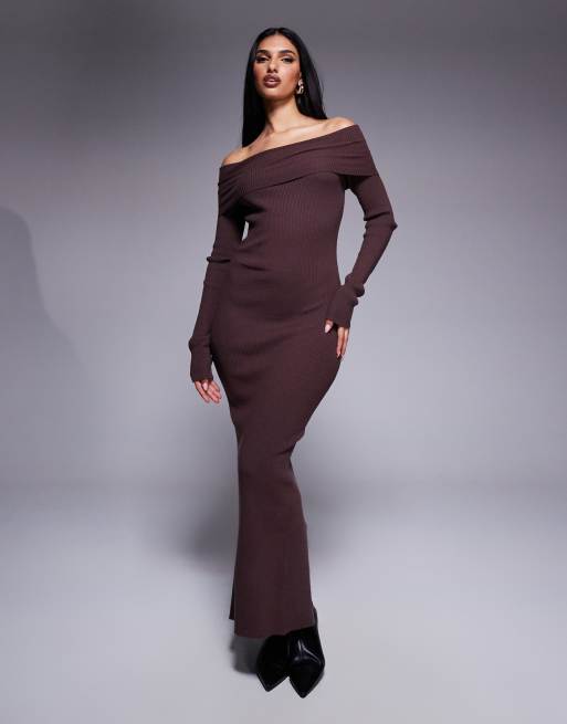 Princess Polly - Gebreide maxi bardot bodycon jurk met brede omslag in bruin