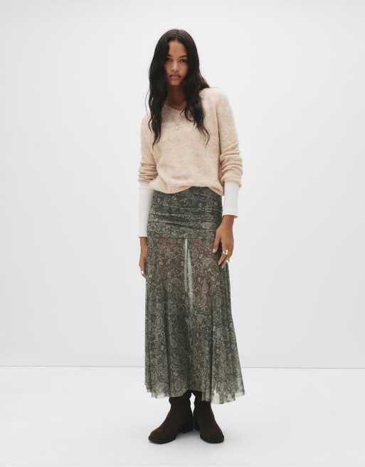 Pull&Bear - Asymmetrische paisley midirok in donker kaki