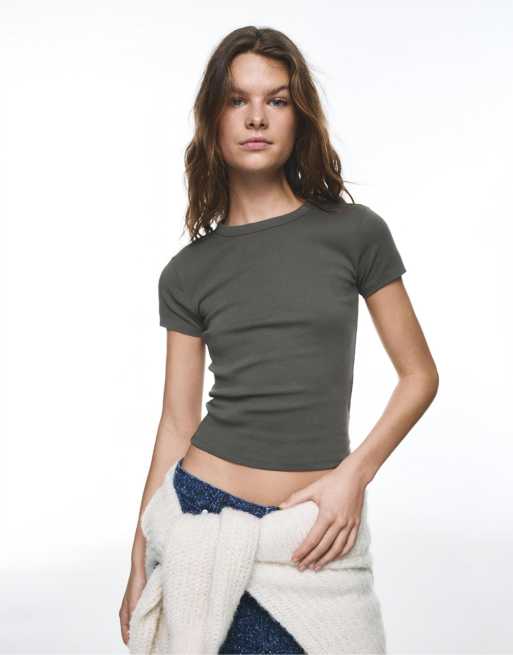 Pull&Bear - Basic nauwsluitend T-shirt in donker kaki
