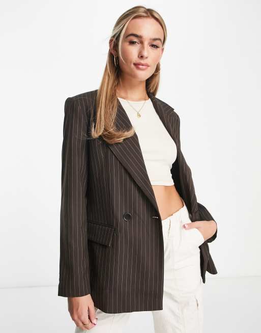 Pull&Bear - Blazer met contrasterende strepen in bruin met krijtstreep