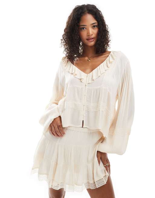 Pull&Bear - Blouse met ruches en kant in ecru, deel van co-ord set