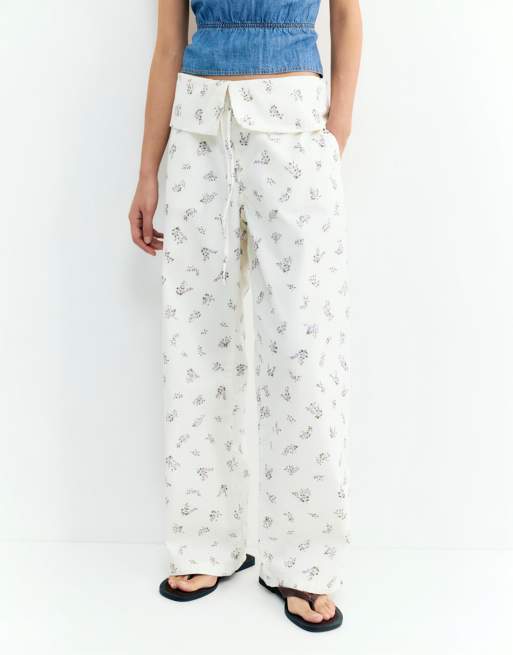 Pull&Bear - Broek met bloemenprint en omgeslagen taille in wit