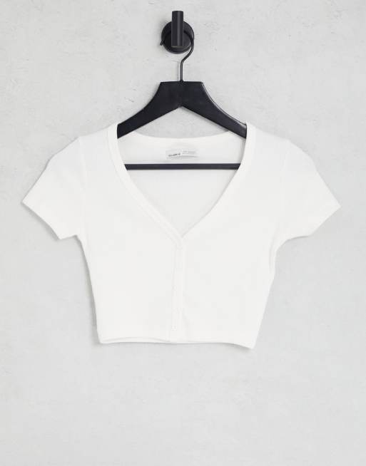 Pull&Bear - Cropped T-shirt met knoopsluiting in wit