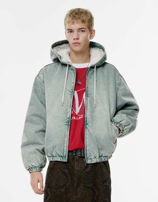 Pull&Bear - Denim jack met capuchon, rits en imitatiebontvoering, in blauw