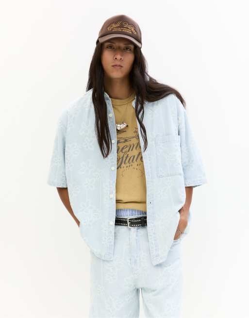 Pull&Bear - Denim overhemd met korte mouwen en bloemenprint in vaal indigo