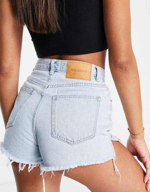 Pull&Bear - Denim short met hoge taille, scheuren en gerafelde zoom in lichtblauw