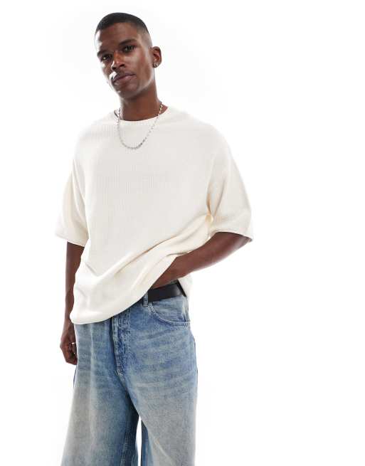 Pull&Bear - Gebreid losvallend T-shirt in gebroken wit