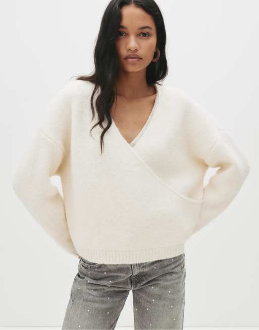 Pull&Bear - Gebreide trui met overslaghals in beige