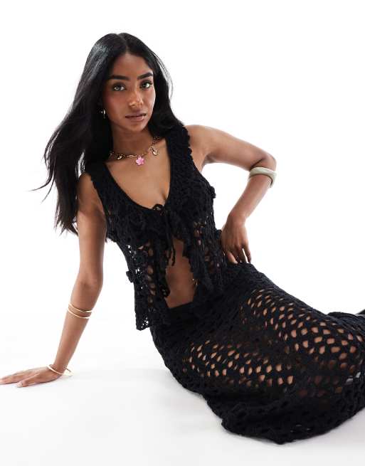Pull&Bear - Gehaakte gebreide top met gestrikte voorkant in zwart, deel van co-ord set
