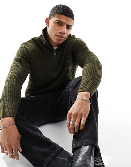 Pull&Bear - Geribbeld gebreide trui met 1/4 ritsje in khaki
