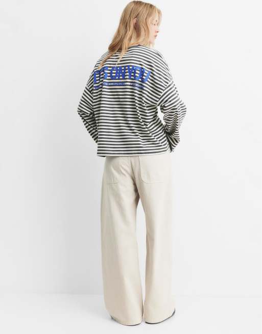 Pull&Bear - Gestreept T-shirt met slogan in asgrijs