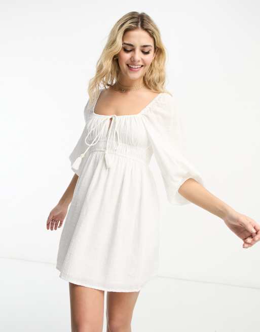 Pull&Bear - Linnen mini jurk met pofmouwen en gestrikte voorkant in wit