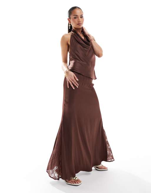 Pull&Bear - Midirok van satijn met kant in bruin, deel van co-ord set