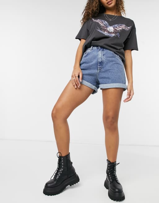 Pull&Bear - Mom shorts van denim met elastische taille in medium blauw