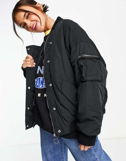 Pull&Bear - Oversized bomberjack met contrasterende voering in zwart