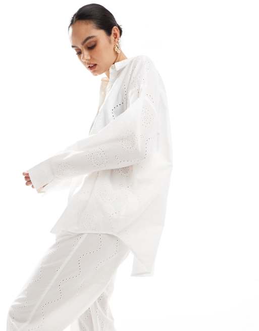 Pull&Bear - Oversized overhemd met broderie detail in wit, deel van co-ord set