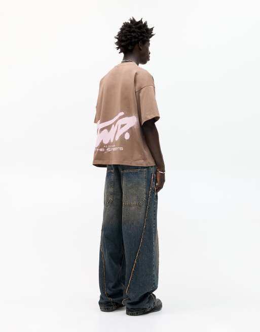 Pull&Bear - T-shirt met korte mouwen en STWD graffiti-print in bruin