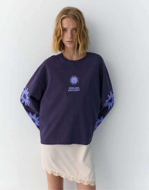 Pull&Bear - T-shirt met lange mouwen en zonneprint in marineblauw