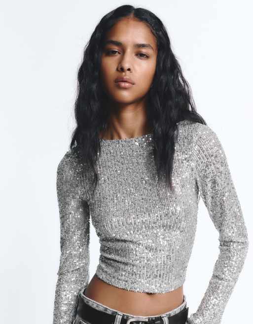 Pull&Bear - Top met lange mouwen en lovertjes in zilver
