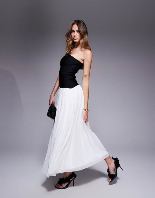 Rare London - Maxi jurk met blote schouder, verlaagde taille en contrasterende tule rok in zwart en wit