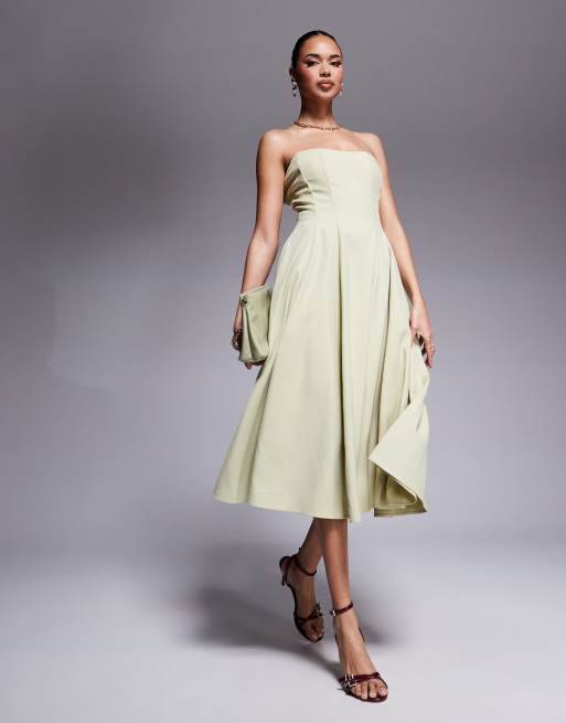 Rare London - Midi bandeau-jurk met korset en volle rok in olijfgroen