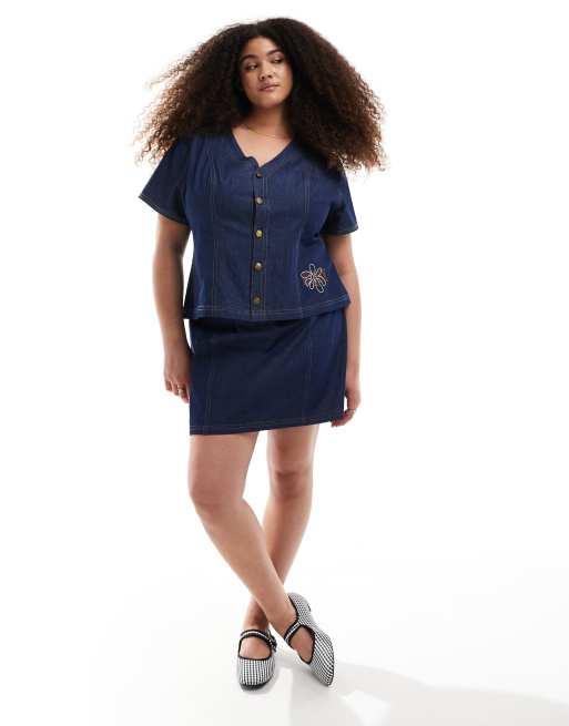 Renee Studio - Exclusive - Denim co-ord set van top met korte mouwen en knopen en mini rok in donkere wassing blauw