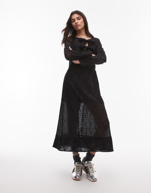 Résumé - Broderie midaxi-jurk met bandjes aan de voorkant in zwart