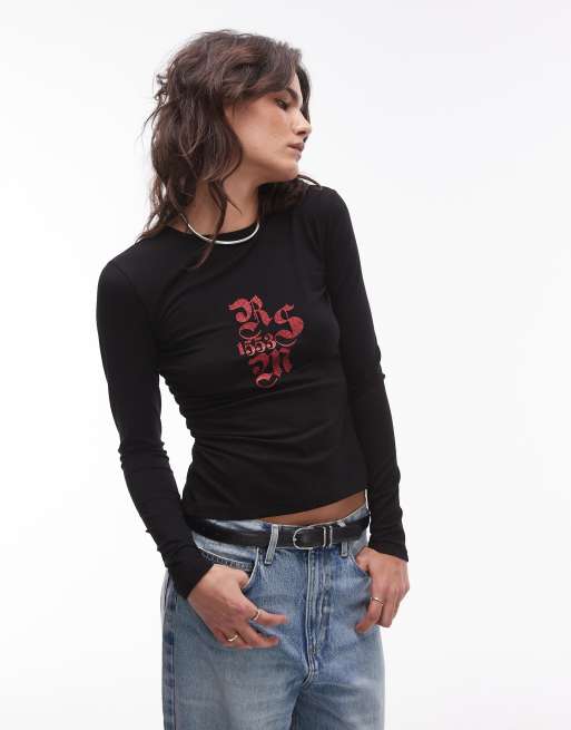 Resume - Top met lange mouwen en rode glitterprint in zwart