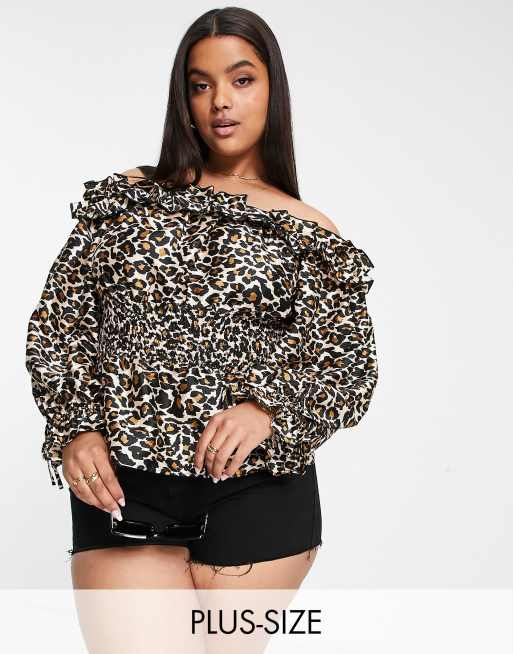 River Island Plus - Bardot blouse met gesmokte taille in dierenprint