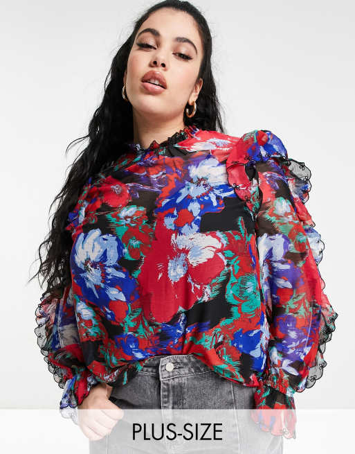 River Island Plus - Blouse met bloemen en ruches op de mouwen in rood