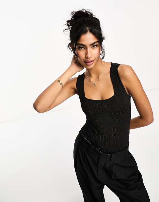 River Island - Body van gladde stof met vierkante hals en hotfix in zwart