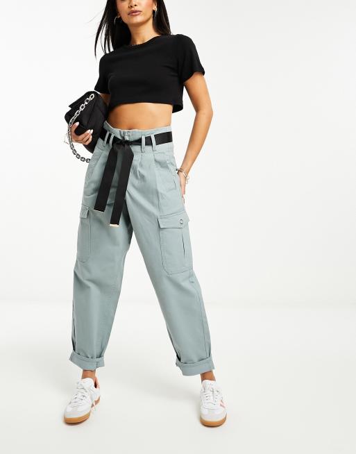 River Island - Cargobroek met riem en taille met plooirand in blauw
