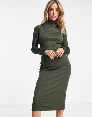River Island - Hoogsluitende geribbelde midi-jurk in kakigroen