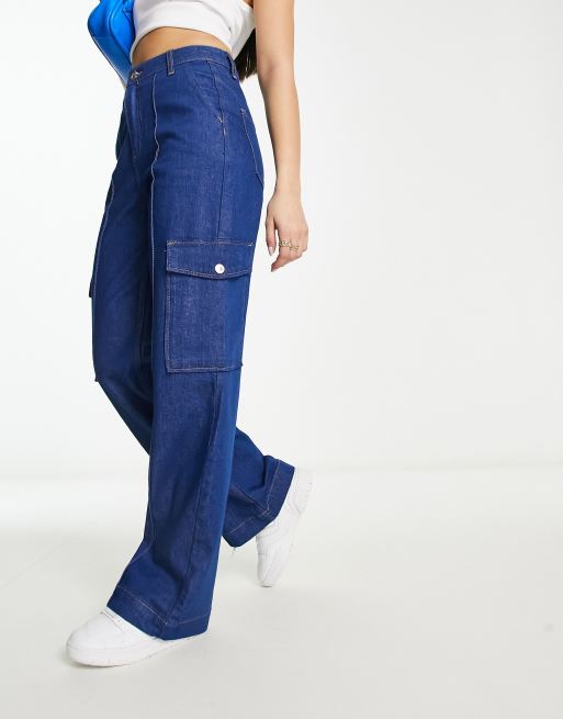 River Island - Jeans met wijde pijpen, cargozakken en hoge taille in middenblauwe wassing