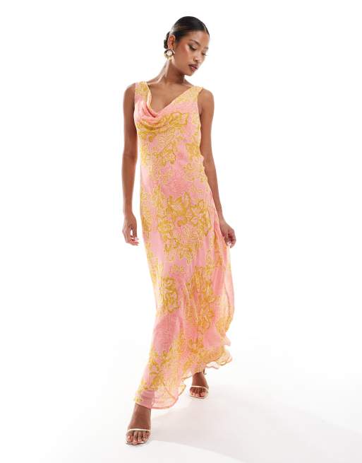 River Island - Maxi-jurk met gedrapeerde halslijn en bloemenprint in felroze