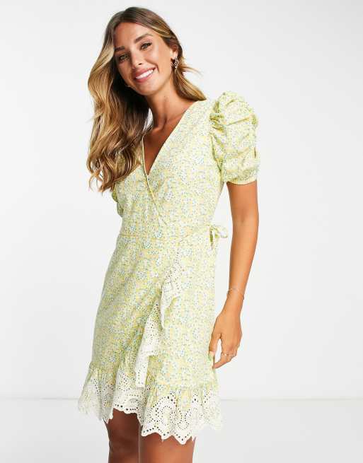 River Island - Nette mini-jurk met overslag, broderie en fijne bloemenprint in geel