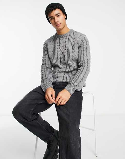 River Island - Smalle trui met ronde hals en kabels in donkergrijs