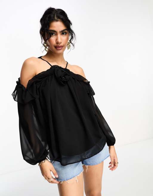 River Island - Top met blote schouders en corsage in zwart