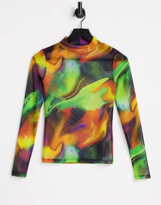 River Island - Top van mesh met lange mouwen en vloeibare print in oranje