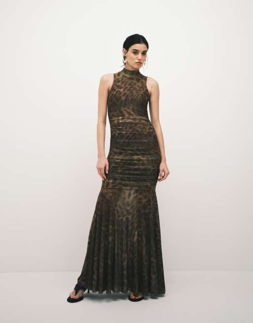 Ruched Ready - Mouwloze vormgevende maxi jurk van mesh met hoge hals, gedrapeerde fishtail en vervaagde luipaardprint