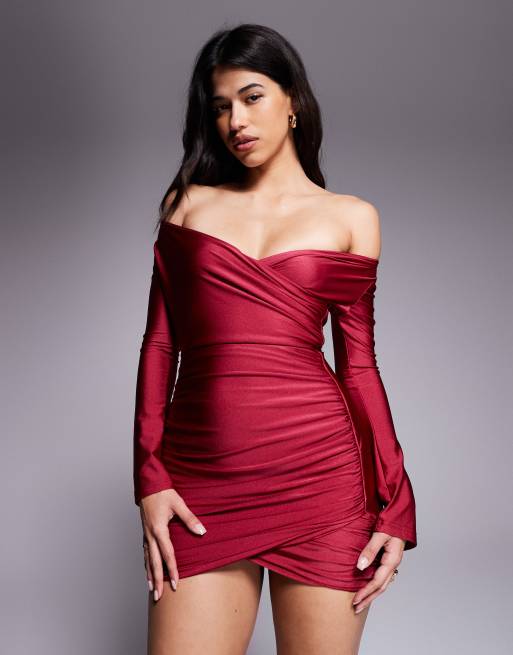 Ruched & Ready - You Wish - Gemodelleerde hoogsluitende mini-jurk met blote schouders en hartvormige halslijn in hoogglanzend kersenrood