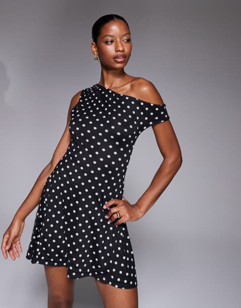 Kaiia - Exclusives - Mini skaterjurk van gelaagd glad mesh met blote schouders en stippenprint in zwart-wit