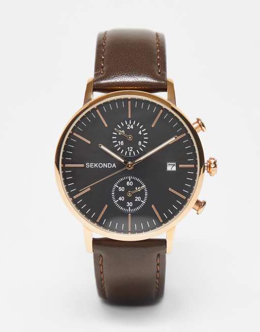 Sekonda - Horloge met leren bandje en meerdere wijzerplaten in zwart en roségoud